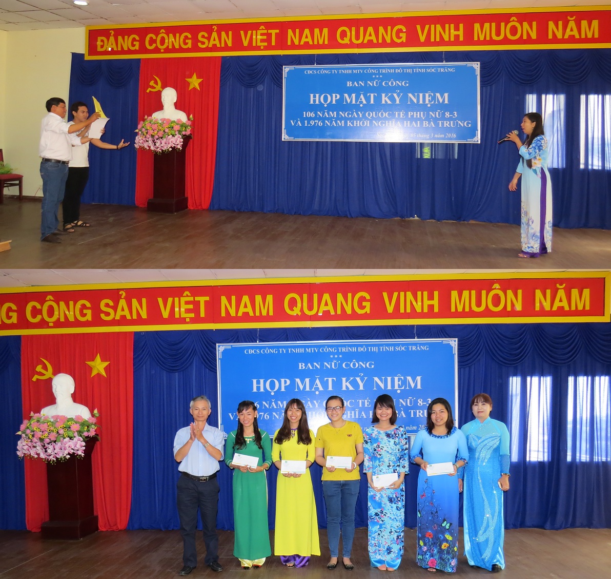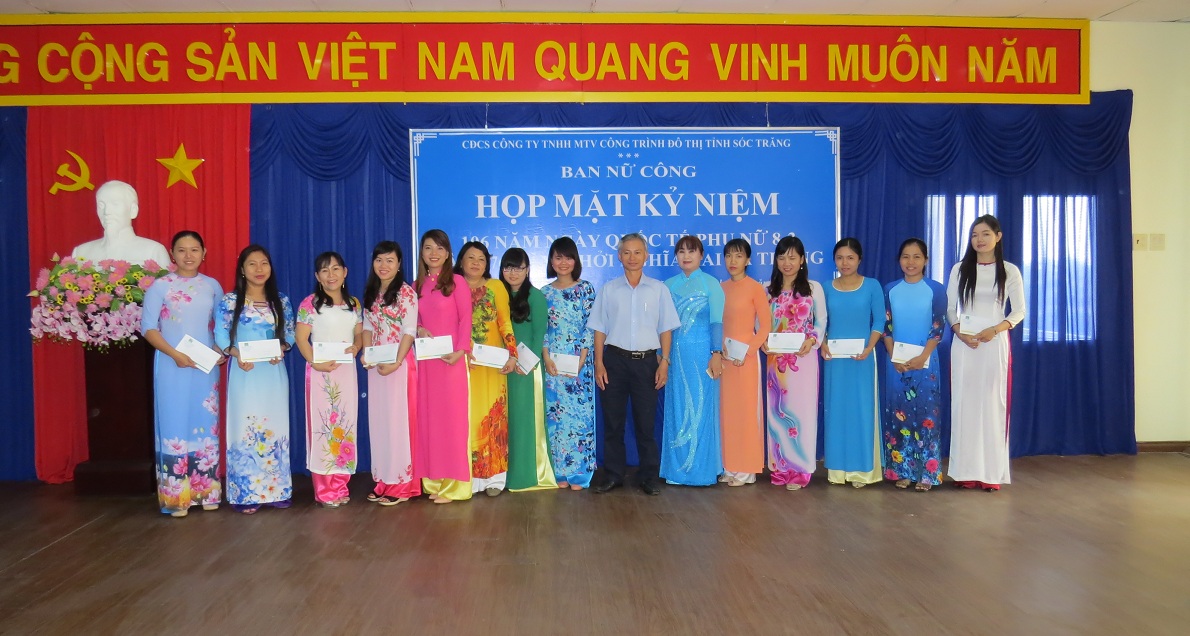 Sáng ngày 5/3/2016, Công ty TNHH MTV Công trình Đô thị tỉnh Sóc Trăng đã tổ chức buổi họp mặt kỉ niệm ngày Quốc tế phụ nữ 8/3 và cuộc khởi nghĩa Hai Bà Trưng. Đến tham dự buổi Họp mặt có Bà Đoàn Thị Bích Nga – Phó Tổng giám đốc Công ty; ông Nguyễn Đức Khôi – Kiểm soát viên Công ty; Bà Nguyễn Thủy Ngân - Chủ tịch công đoàn, trưởng ban nữ công; Bà Nguyễn Thu Trang – Phó Chủ tịch Công đoàn cùng đại diện lãnh đạo các phòng, ban, xí nghiệp, đội và toàn thể CNVC-NLĐ nữ Công ty.