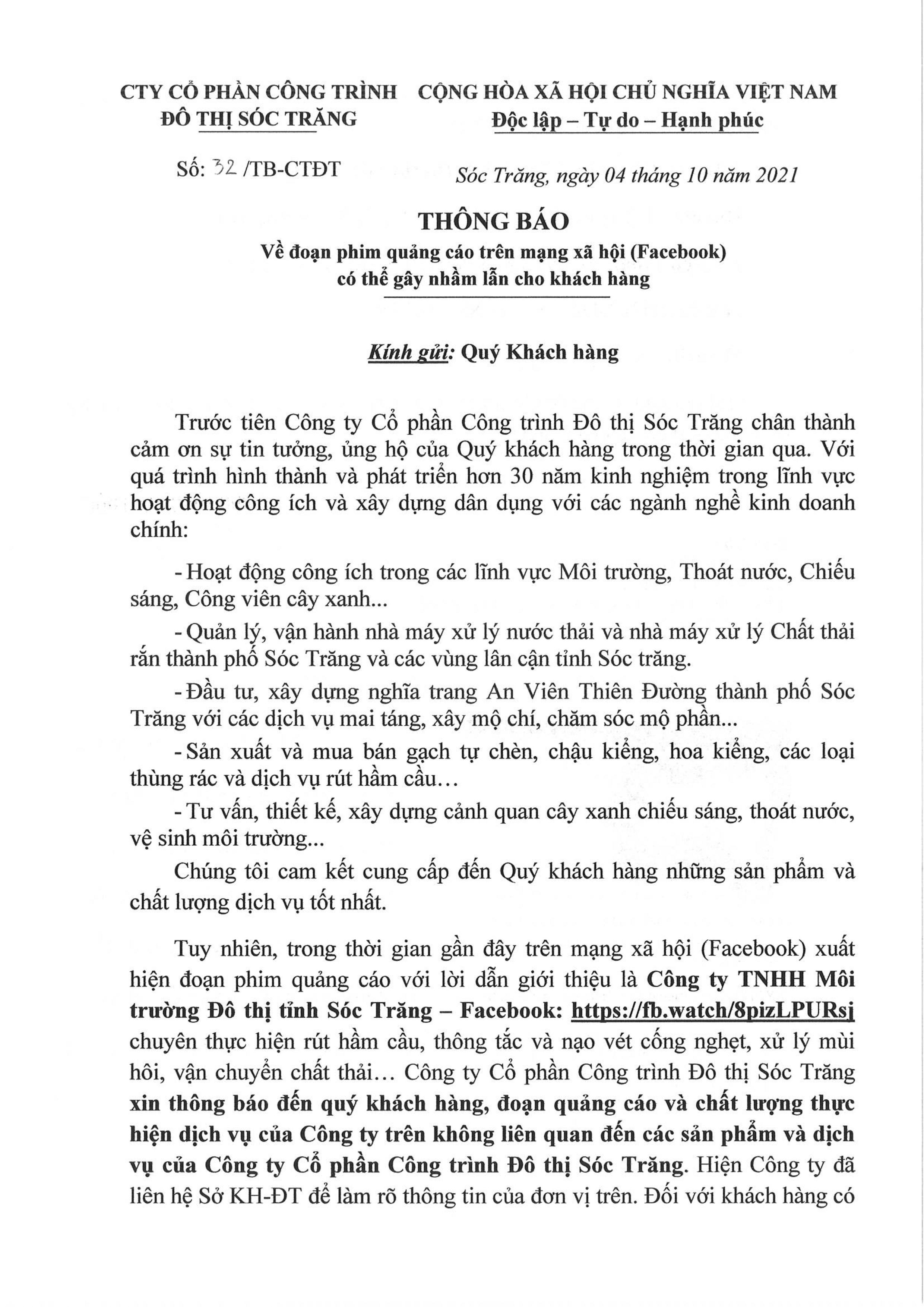 Công ty Cổ phần Công trình Đô thị Sóc Trăng hân hạnh được phục vụ quý khách hàng!